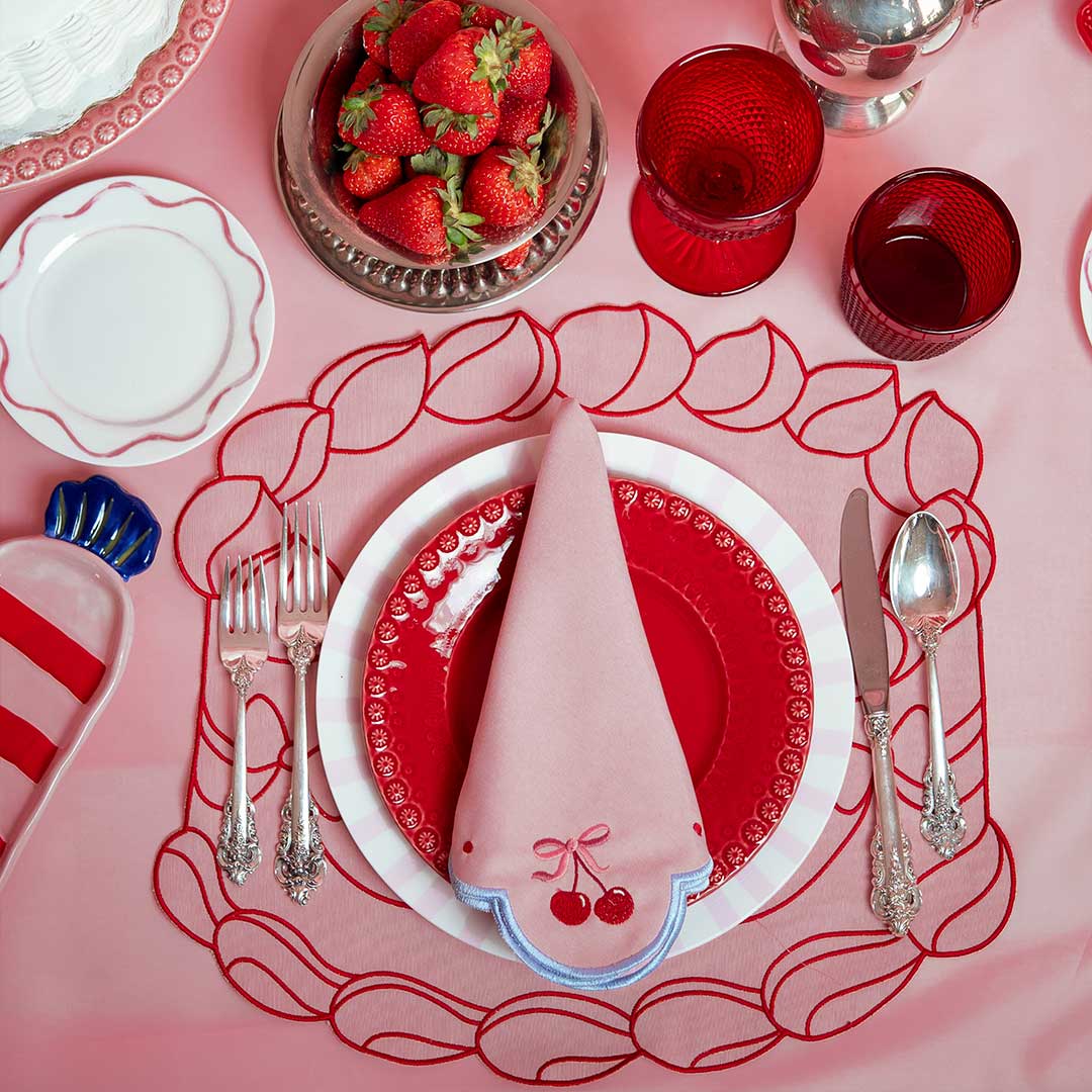 Servilletas Cherry en Algodón Rosa con Bordado de Moño y Cerecitas. Set de 4.