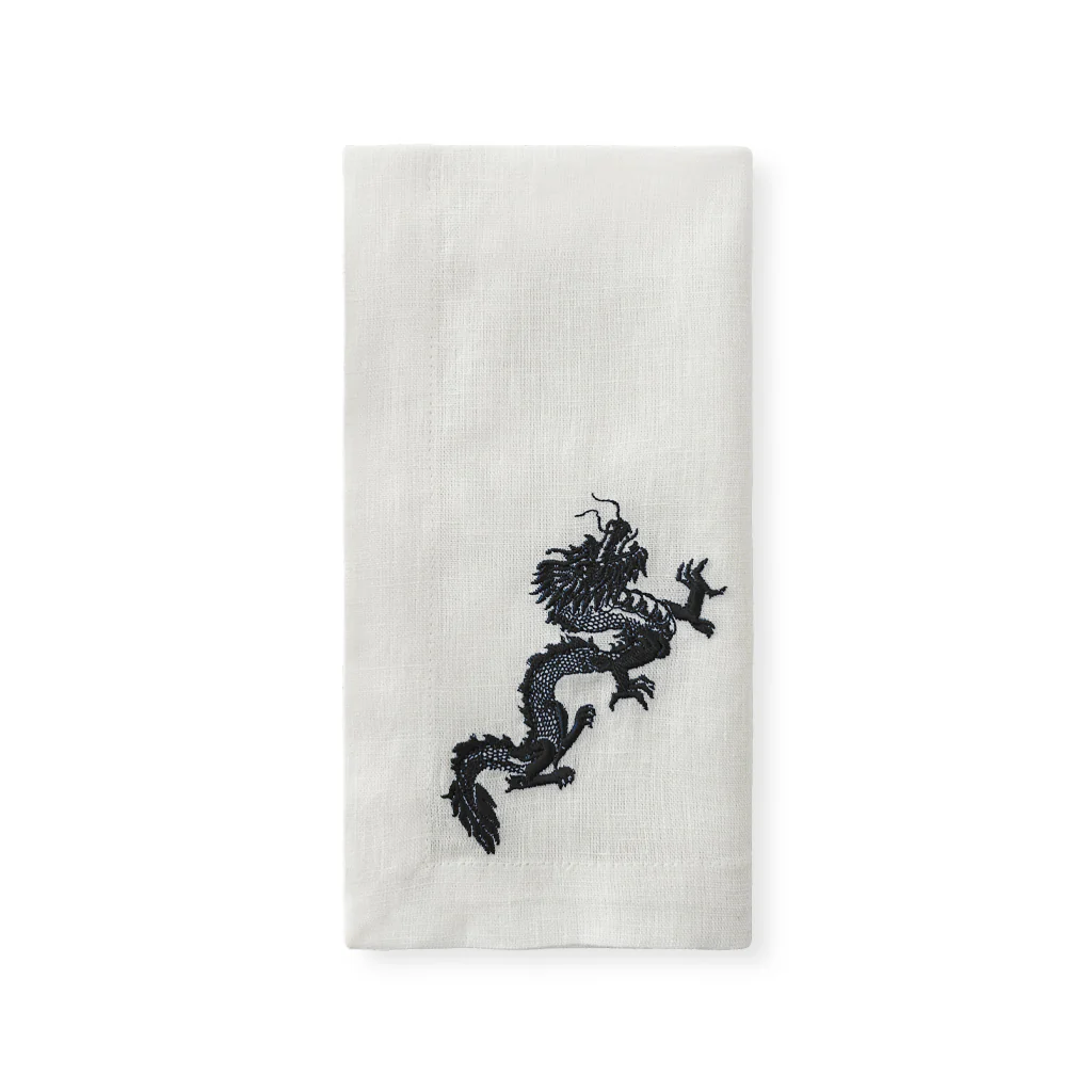 Servilletas en Lino Blanco con Bordado de Dragón Negro. Set de 4