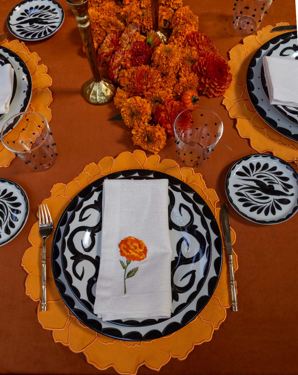 Servilletas Flora con Bordado de Cempasúchil en Lino Crudo. Set de 4