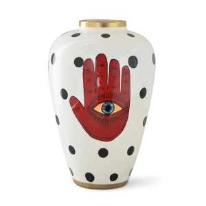 Vasija de Cerámica en Color Blanco con Puntos Negros y Mano con Ojo MÃstico.