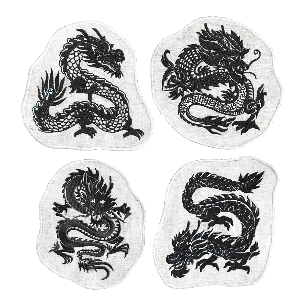 Cocteleras en Lino Blanco con Bordado de Dragón Negro. Set de 4