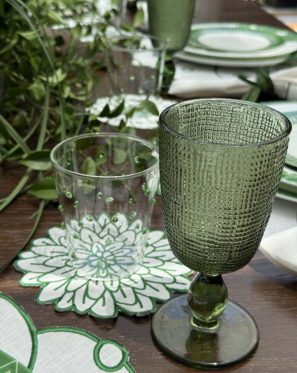 Coasters Identidad en Lino Blanco con Bordado de Biznaga, Pasiflora y Dalia Verdes. Set de 4