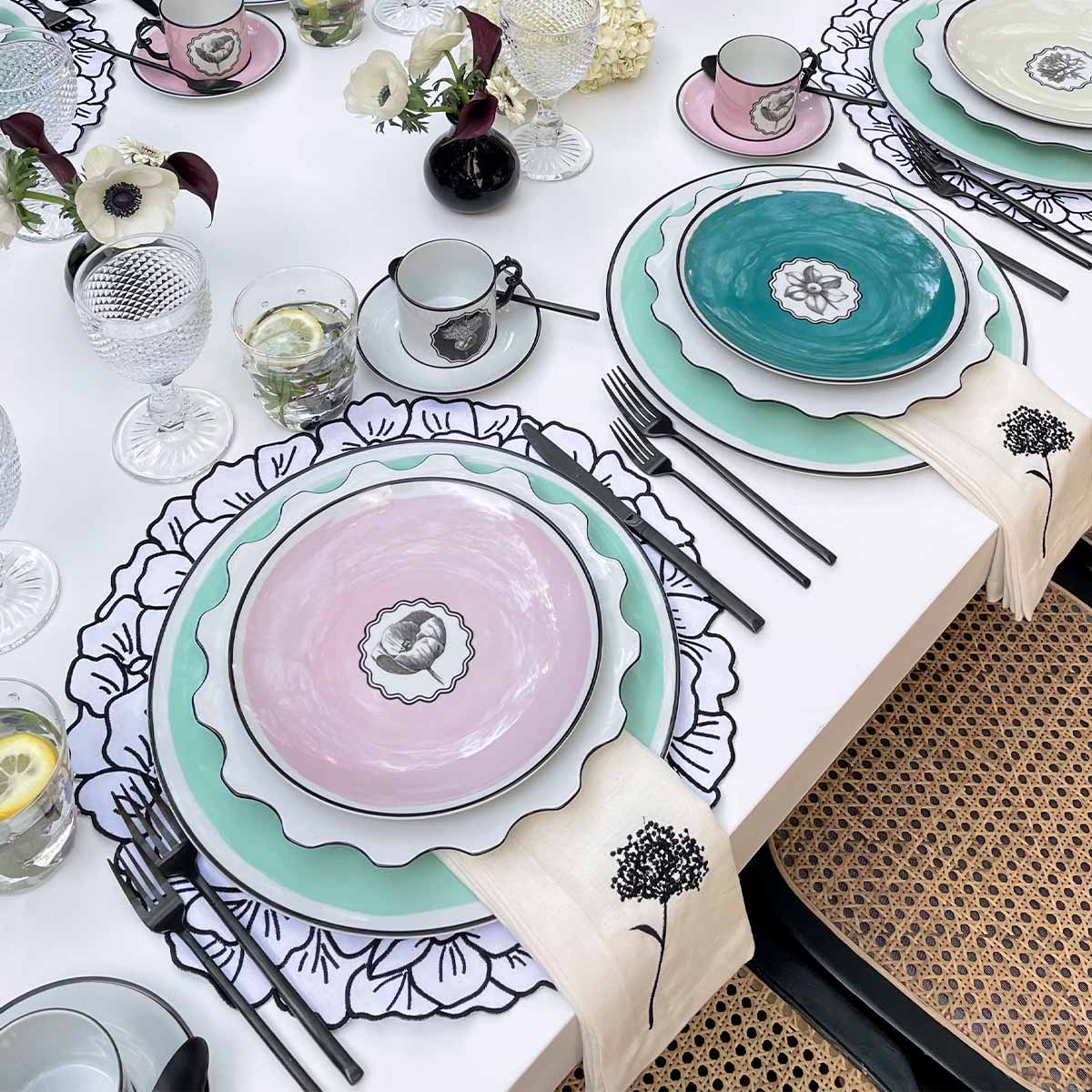 Individuales Bouquet en Algodón Rosa con Bordado de Hortensia. Set de 4