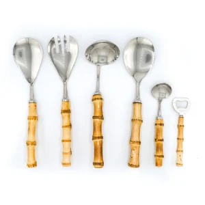 ZASHPACK BAMBÚ: Set de 5 Cubiertos para Servir y Destapador de Botellas con Mango de Bambú