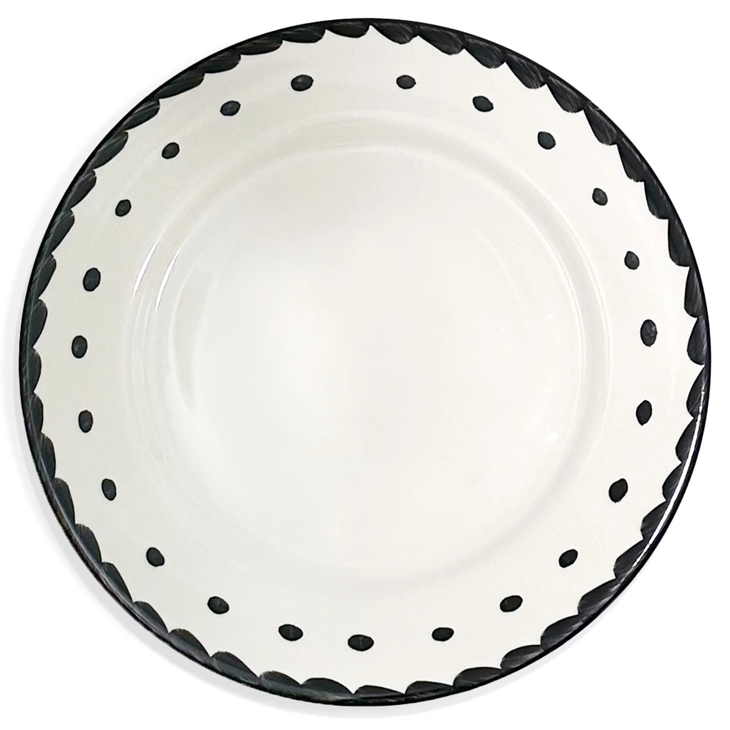 Plato base Puebla en cerámica de Anfora con su tradicional diseño mexicano de plumeado y puntitos en negro elaborado de forma artesanal con diseño exclusivo para Zash.
