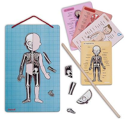 Para niños de 7 a 12 años. 99 piezas. ¡Aprende las diferentes partes del cuerpo humano divirtiéndote! 76 imanes y 1 soporte magnético para recomponer y aprender los nombres de las diferentes partes del cuerpo humano. Incluye 4 tarjetas con información detallada sobre lo siguiente: El esqueleto, los órganos, los músculos y las distintas partes del cuerpo humano (traducidas en francés, inglés, alemán, holandés, español, catalán, vasco, italiano, ruso, danés y japonés). Incluye una varilla indicadora de madera