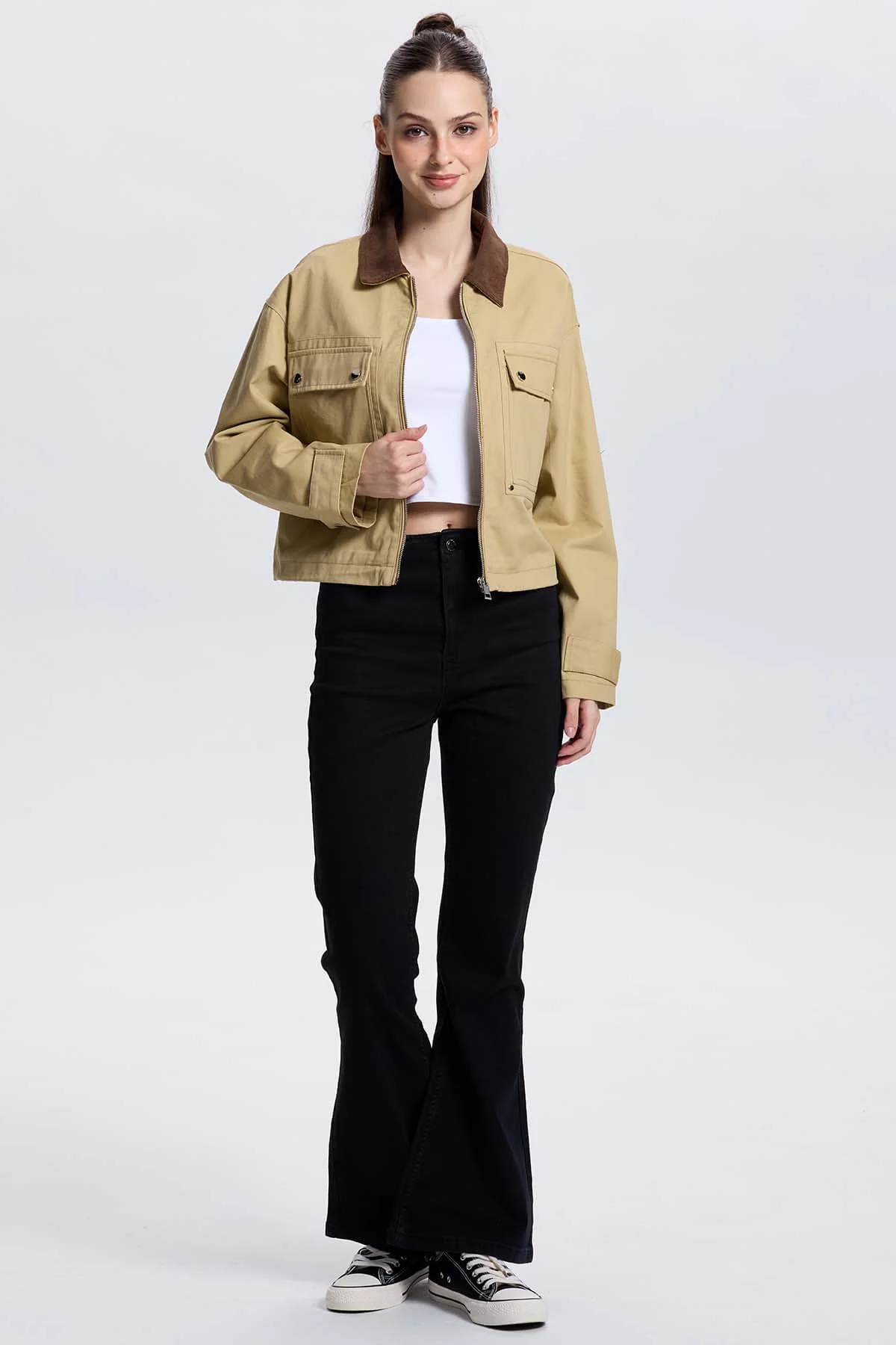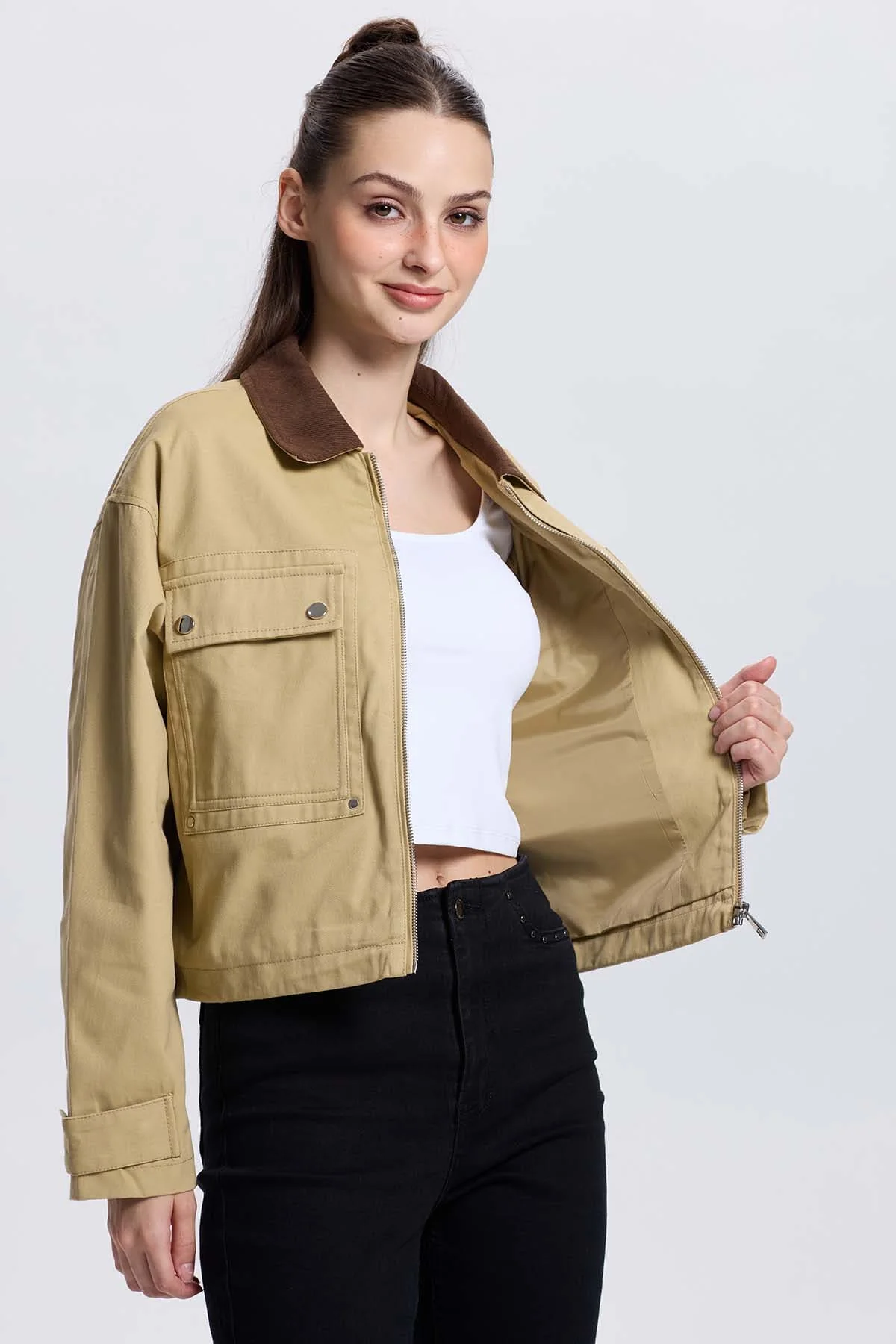 Chaqueta juvenil beige de gabardina 100% algodón, perfecta para primavera y verano. Con bolsillos frontales y cuello contrastante marrón, su diseño es sencillo y funcional. La tela proporciona suavidad y frescura. Ideal para paseos casuales o reuniones al aire libre. Luce esta prenda junto a jeans y poleras para un look relajado y chic.