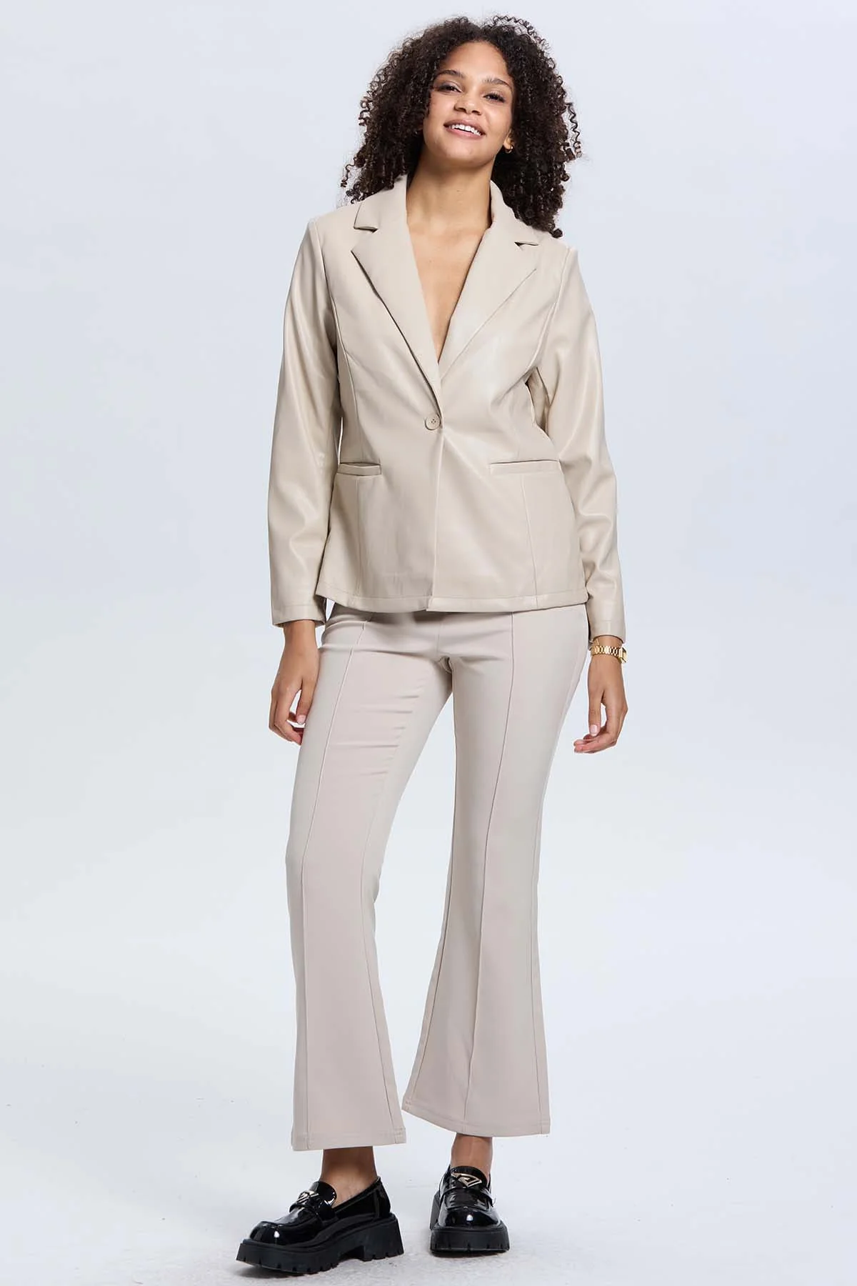 Chaqueta de mujer en color beige con efecto cuero que resalta por su suavidad y elegancia. Su corte recto y cuello solapa brindan un estilo casual ideal para la temporada primavera verano. Con un cierre de botón único, es práctica y ligera. Perfecta para una tarde de café o un dÃa en la oficina. Luce esta prenda junto a unos jeans y una polera básica para un look desenfadado.