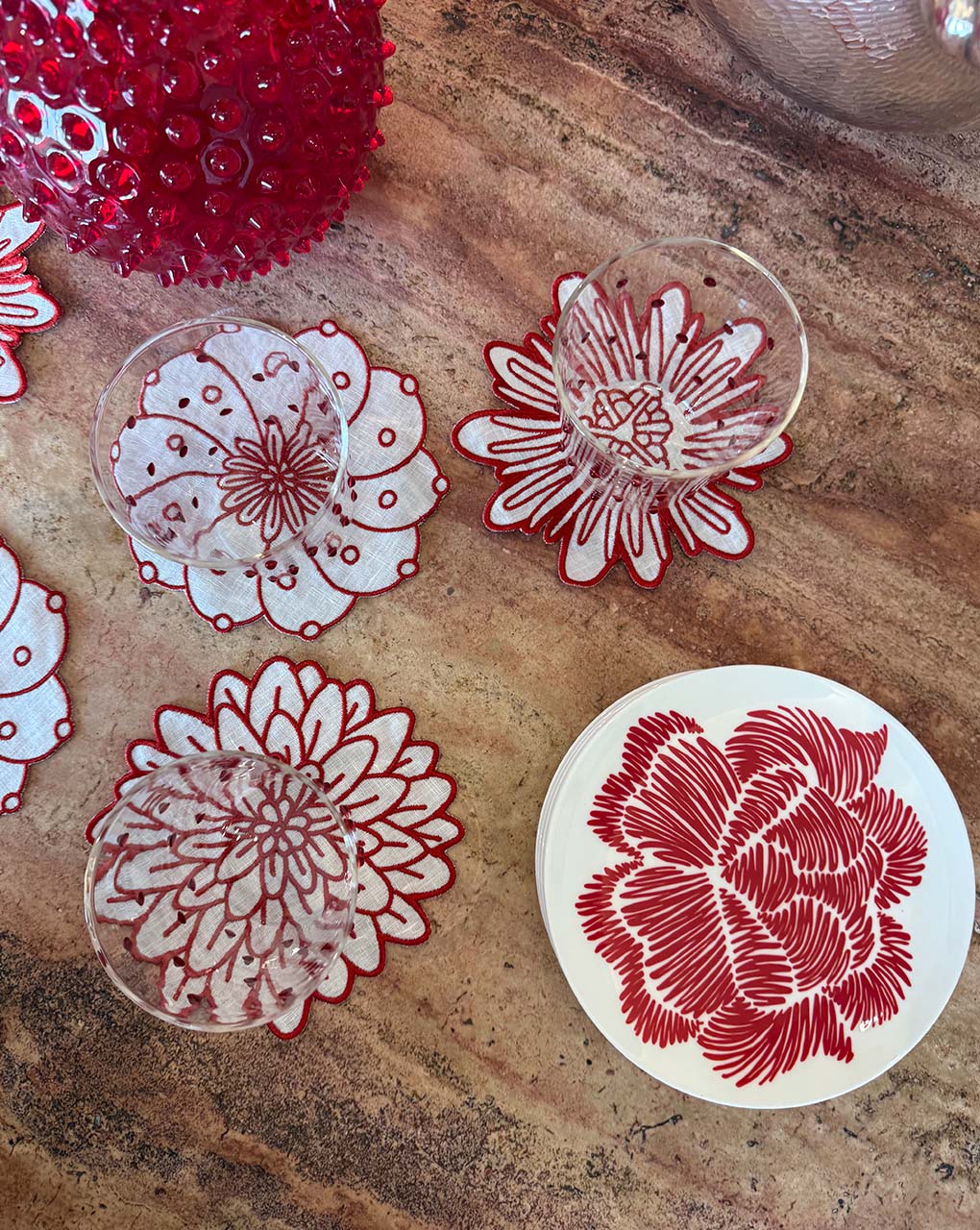 La mantelerÃa IDENTIDAD de SofÃa Aspe Interiorismo la esencia de México en cada mesa. Los coasters son confeccionados en lino español bordado en forma de biznaga, pasiflora y dalia con hilo rojo. Sofisticados y clásicos.