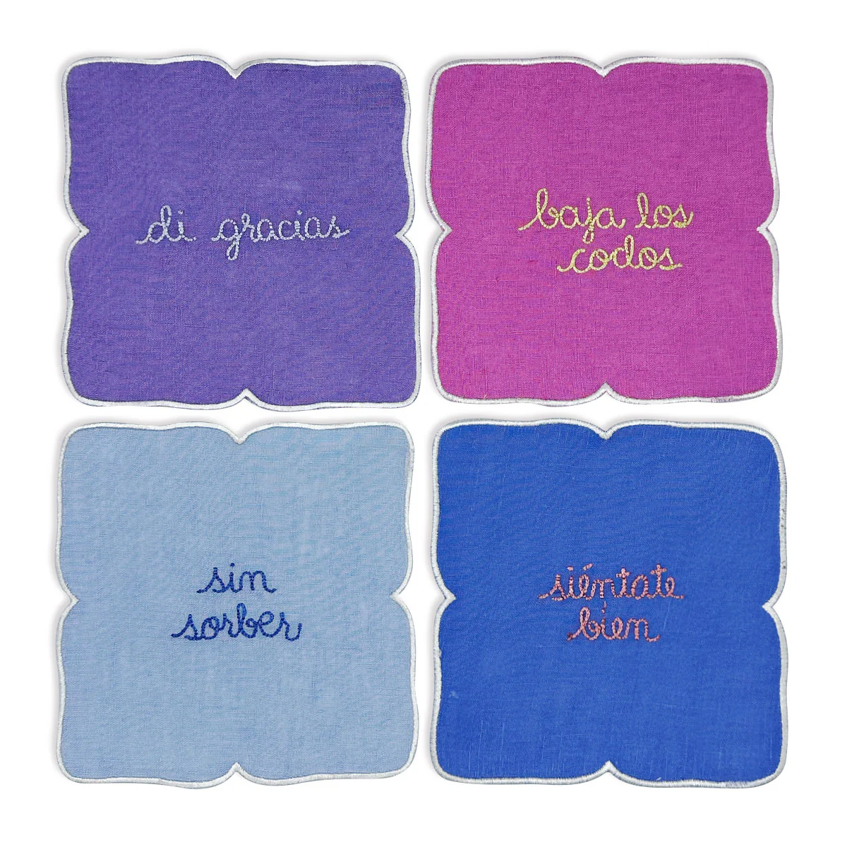 Cocteleras con Frases de Modales en Lino con Bordado de Colores . Set de 4. Vol 2