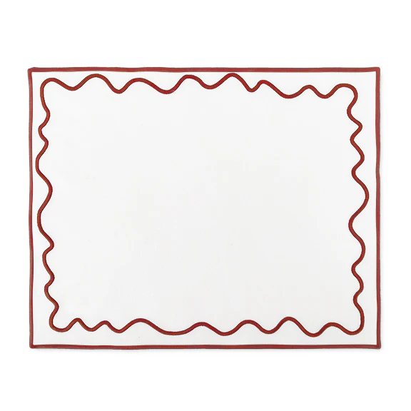 Hermoso set de 4 manteles individuales en loneta blanca con ondas y orilla bordada en rojo brillante.