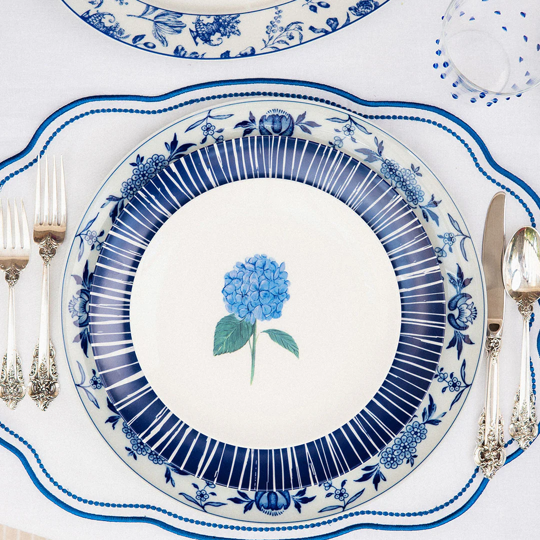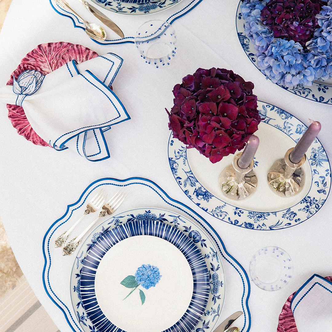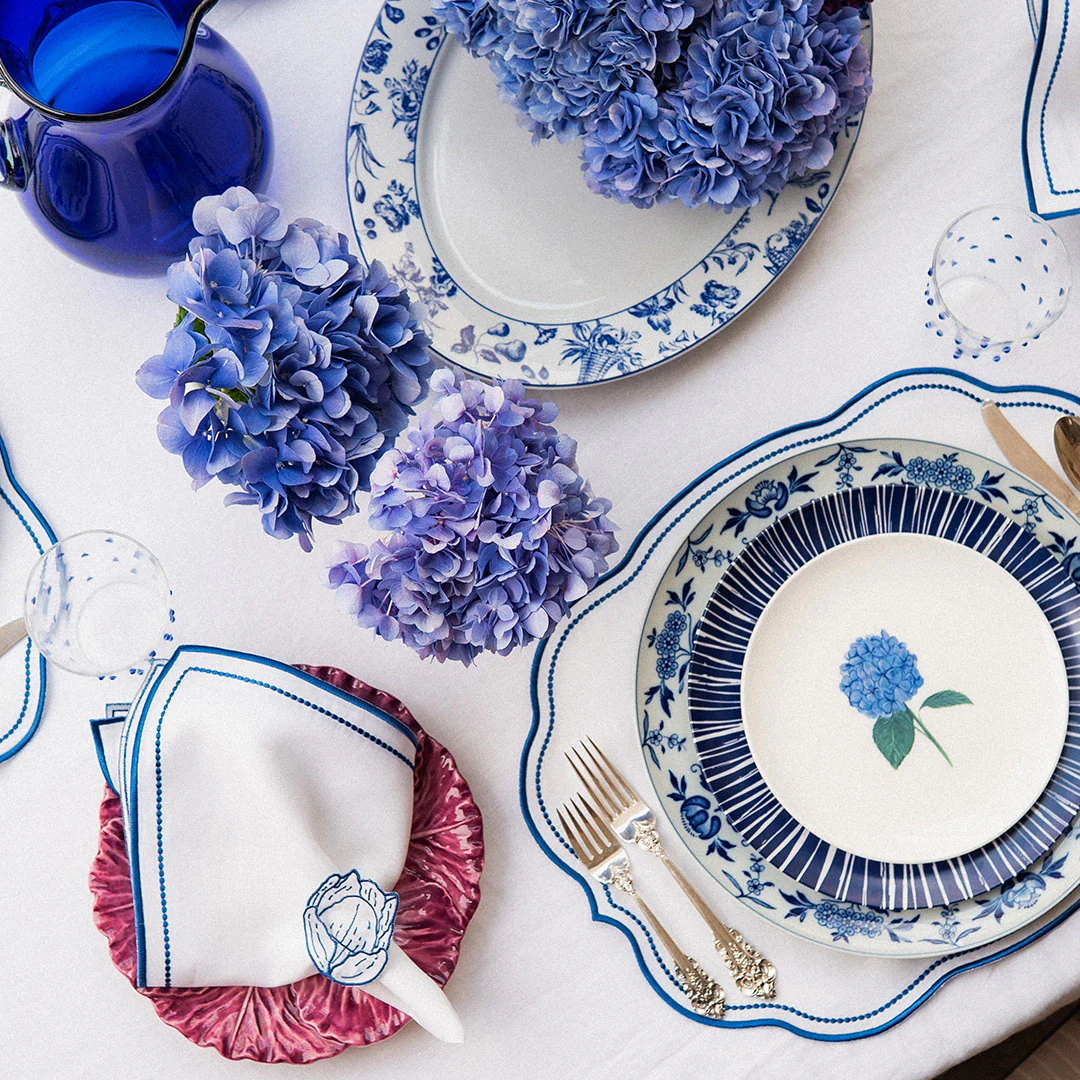 Elegantes manteles individuales en Lino, bordados y recortados cuidadosamente. La combinación de blanco con azul es un clásico que se ve lindo en cualquier época y temporada.