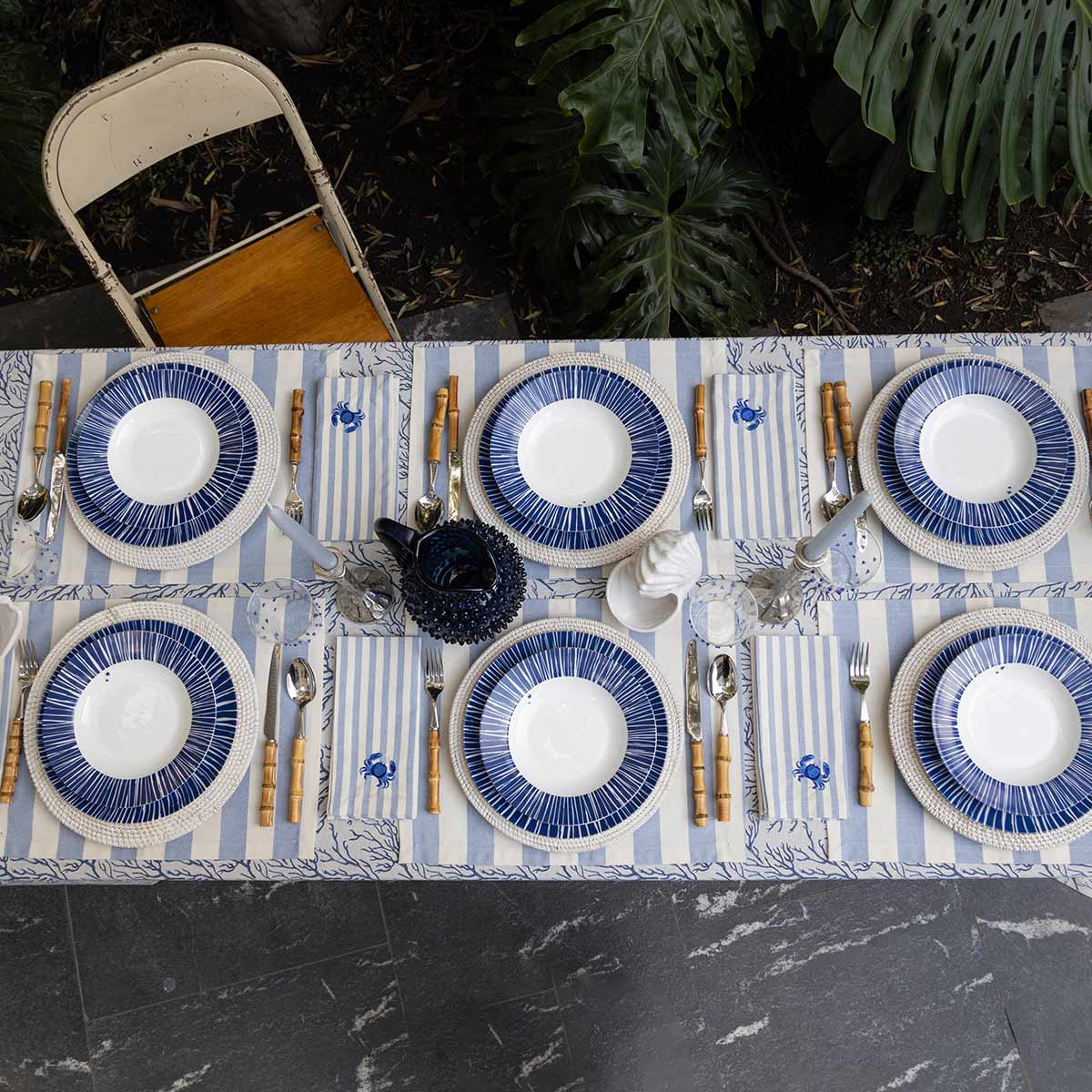 Set de 4 Manteles Individuales de azul rojas con blanco, ideal para mesas frescas y atemporales.