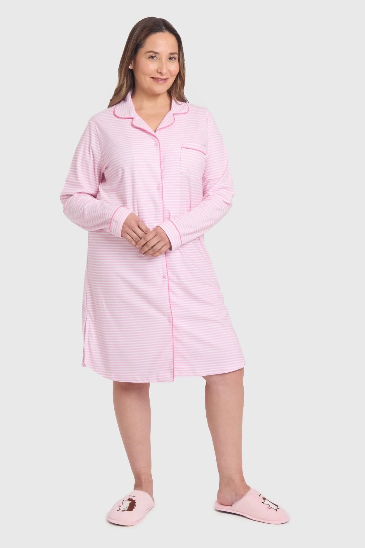 Descubre la comodidad de nuestra camisa de dormir rosada, confeccionada en suave algodón que acaricia tu piel. Su diseño de rayas le da un toque fresco y moderno, ideal para tus noches de descanso. Con un corte relajado y detalles en los puños, esta prenda te brinda abrigo ligero y libertad de movimiento. Perfecta para lucir en casa, te hará sentir elegante y cómoda al mismo tiempo. Renueva tu look nocturno y despierta con estilo cada dÃa. ¡VÃstete de confianza y confort con esta hermosa camisa de dormir!