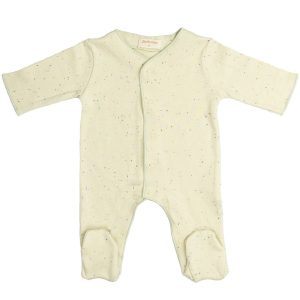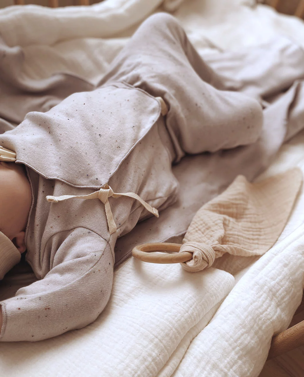 Conjunto orgánico de camiseta cruzada y polaina. Tejido interlock en algodón orgánico con un 2% de PES reciclado formando motas de colores que sobresalen del propio tejido. Los pequeños detalles en el diseño y la calidad del tejido convierten esta exclusiva cápsula en todo un best seller.