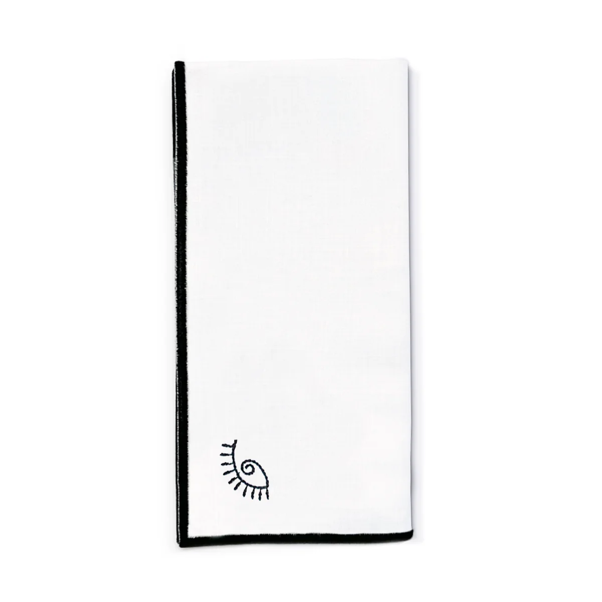 Juego de 4 elegantes y mÃsticas servilletas en lino blanco con orilla en negro y motivo de ojo de la suerte bordado.