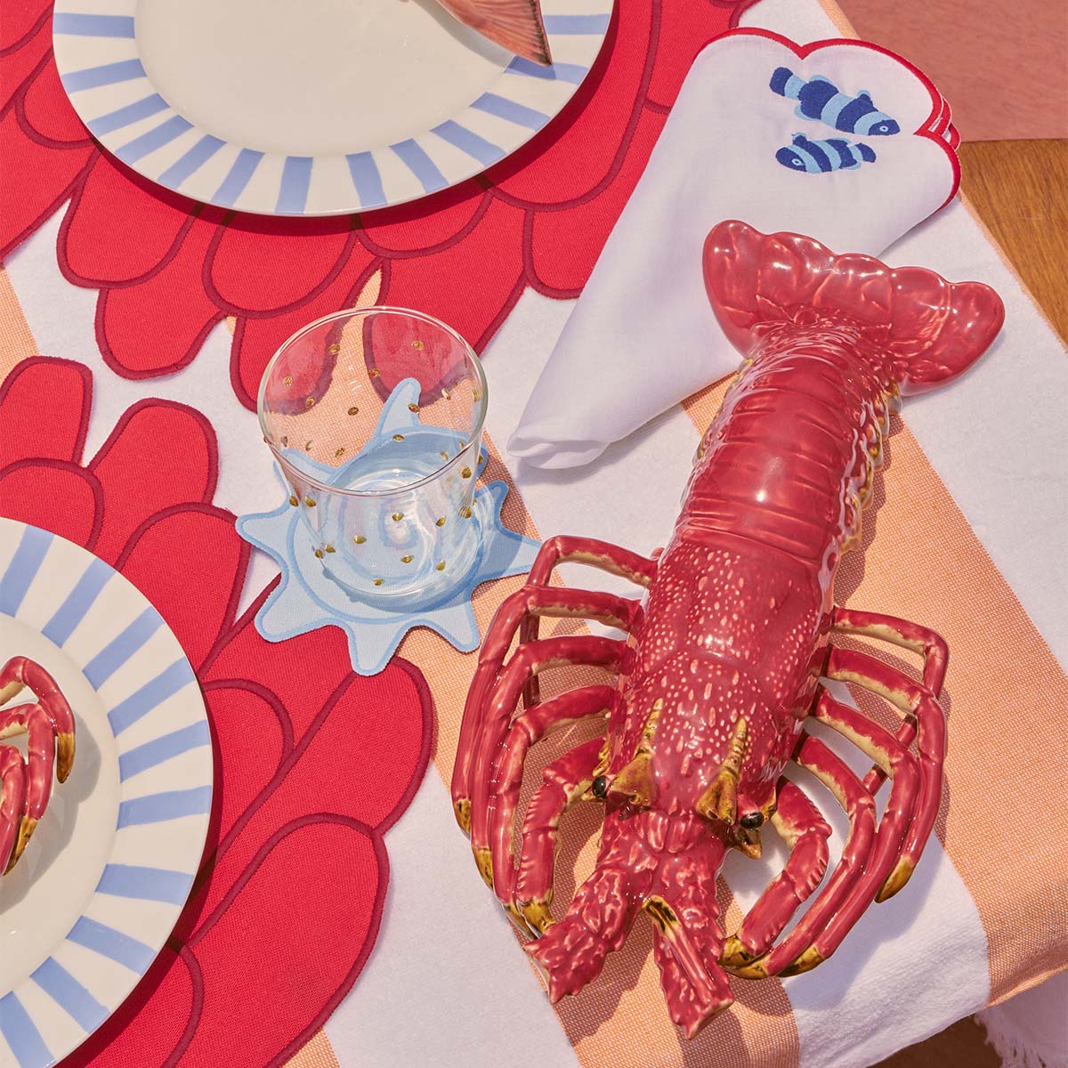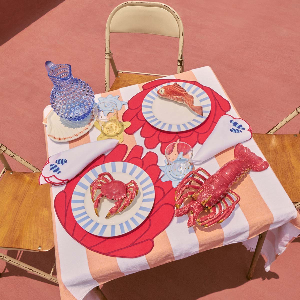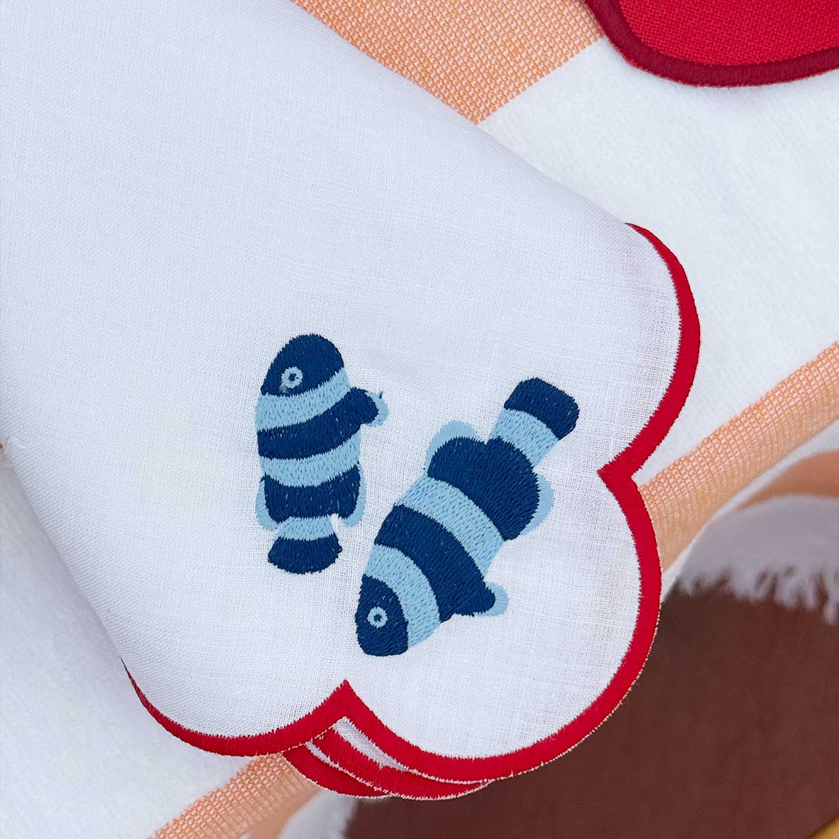 Servilletas con peces, te vas a enamorar. Lino prelavado con una pareja de peces bordados en tonos de azul y orilla bordada en rosa. La collab con AMOATO que hace de la mesa un arrecife mágico y divertido. Ideal para mesas en la playa o cualquier lugar que celebre el verano.