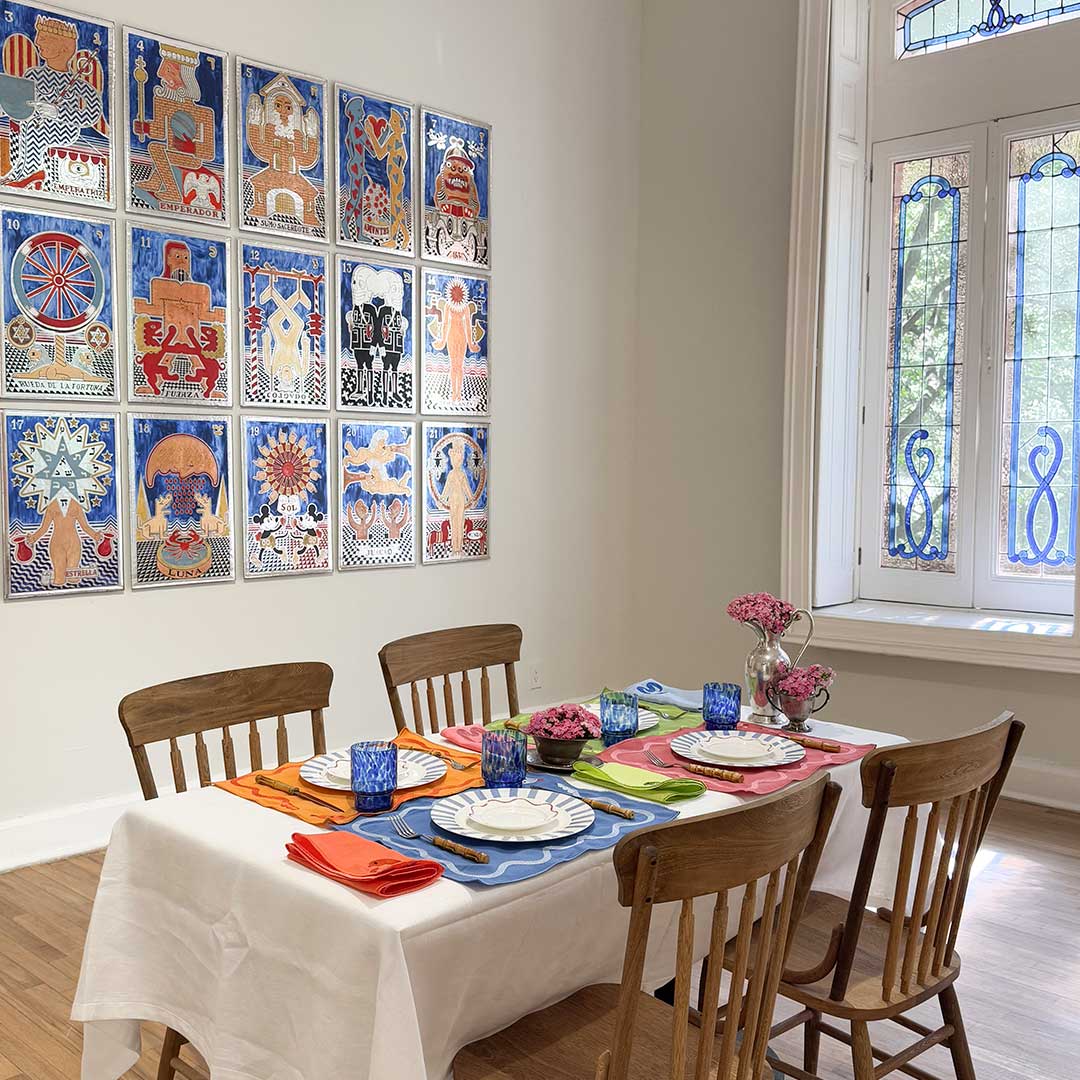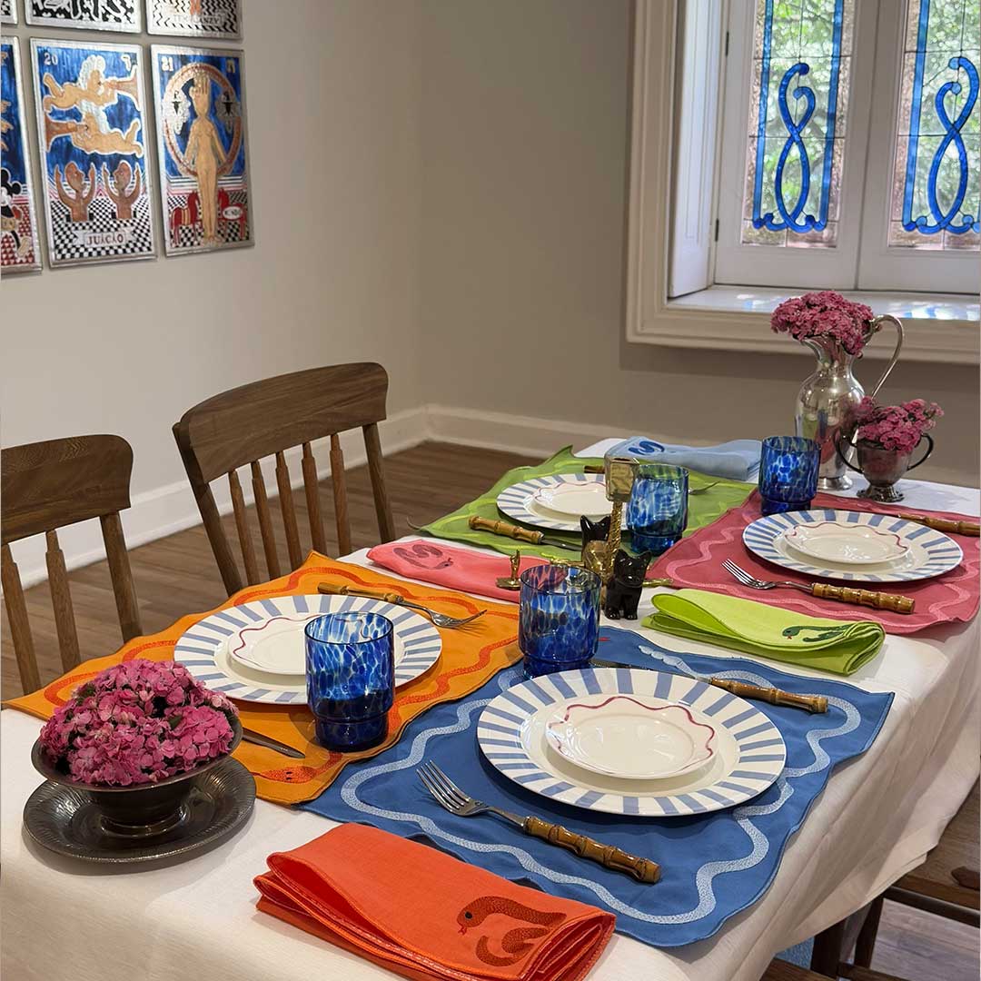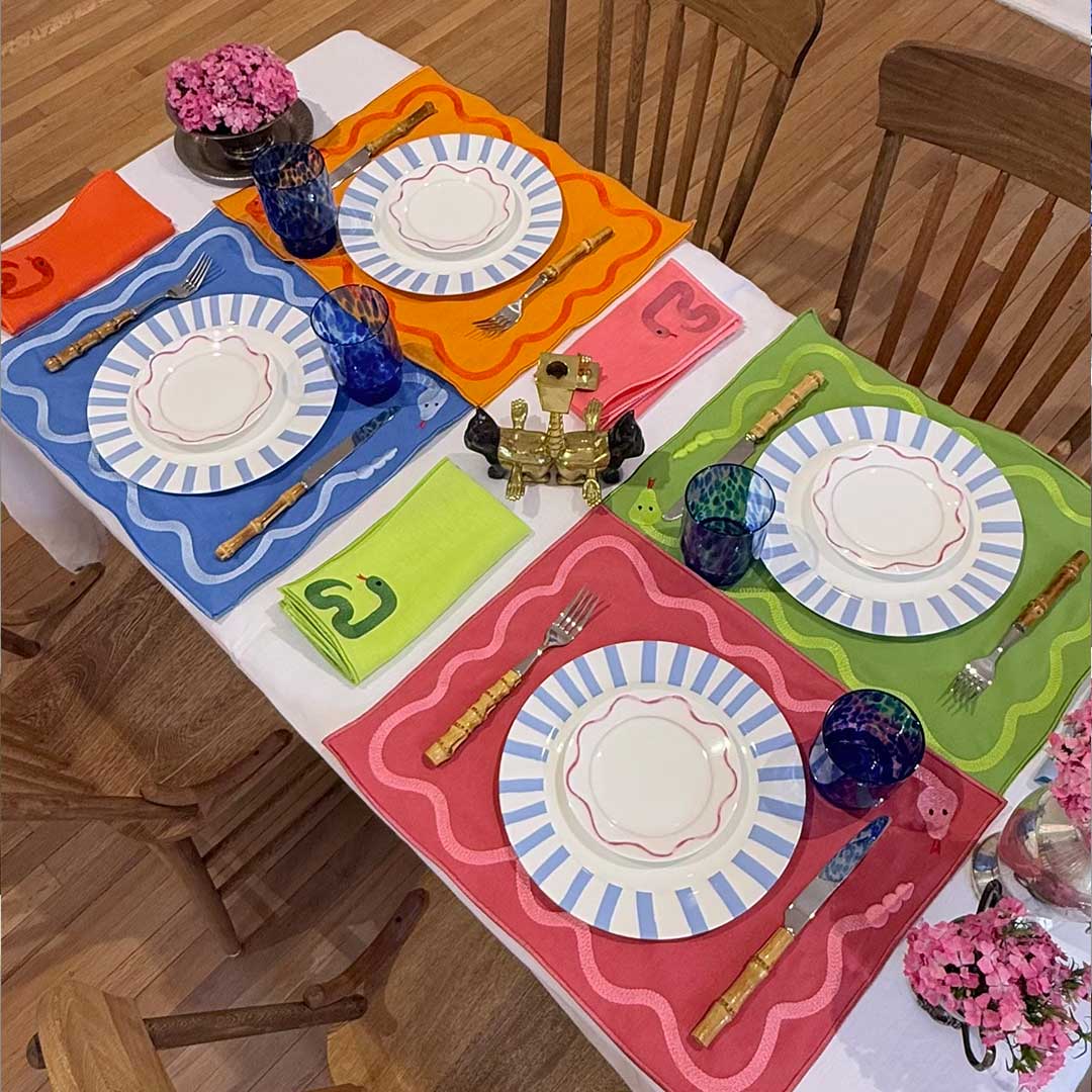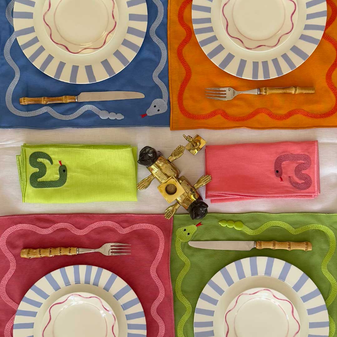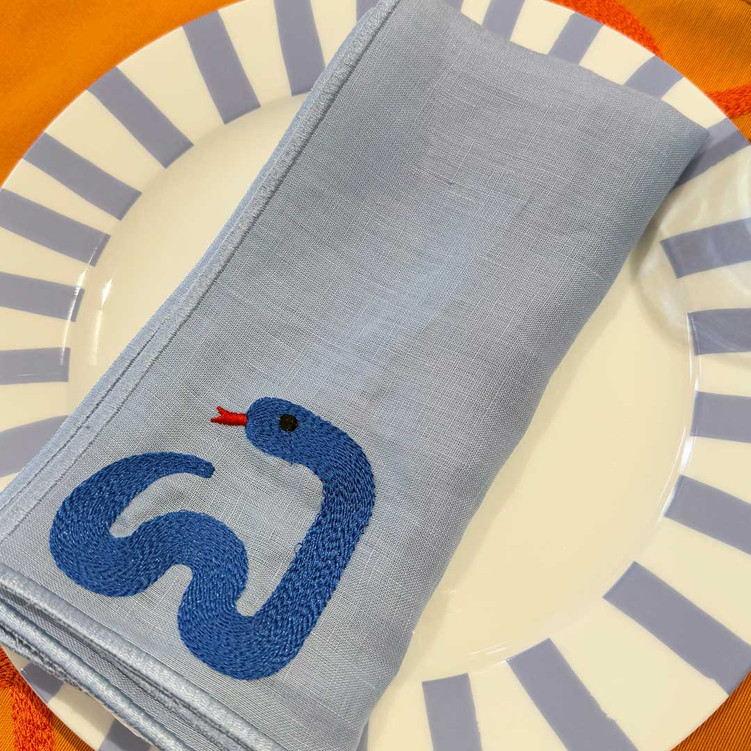Las servilletas Culebra en colores vibrantes: azul, verde, naranja y fucsia bordadas con una serpiente coqueta sobre lino prelavado, Un Pop of Color para tu mesa. Inspiradas en el año nuevo chino.