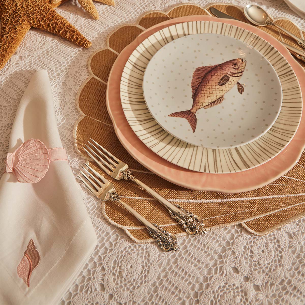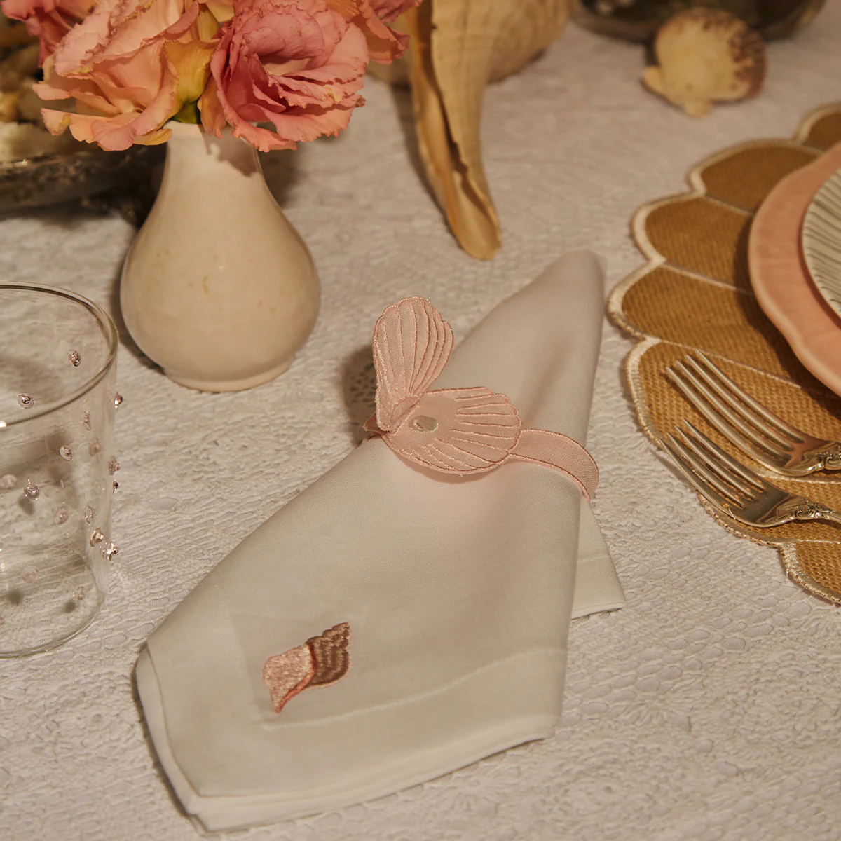 Servilletas de lino con bordado de caracol de mar. Clásicas, chic y perfectas para cualquier mesa.
