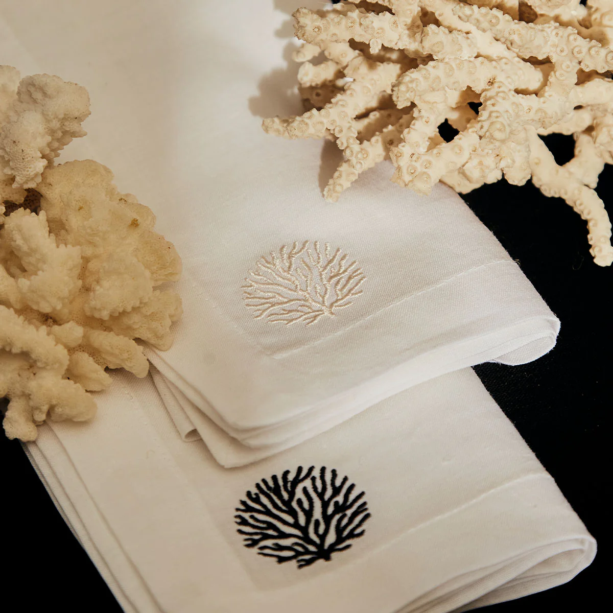Servilletas de lino con bordado de coral ivory. Clásicas, chic y perfectas para cualquier mesa.