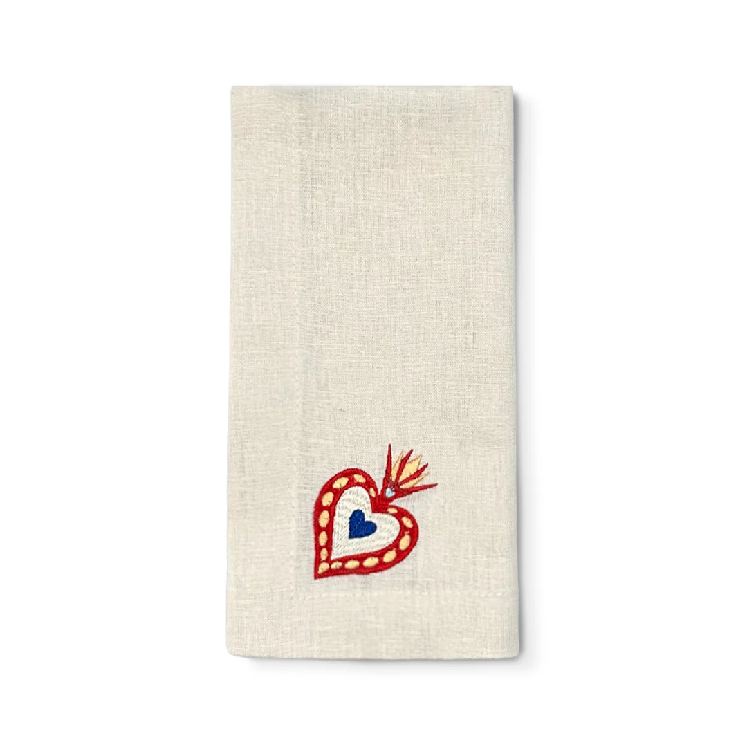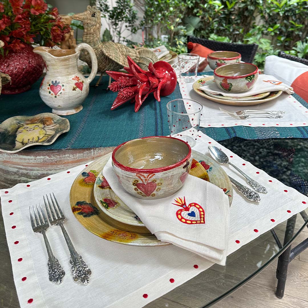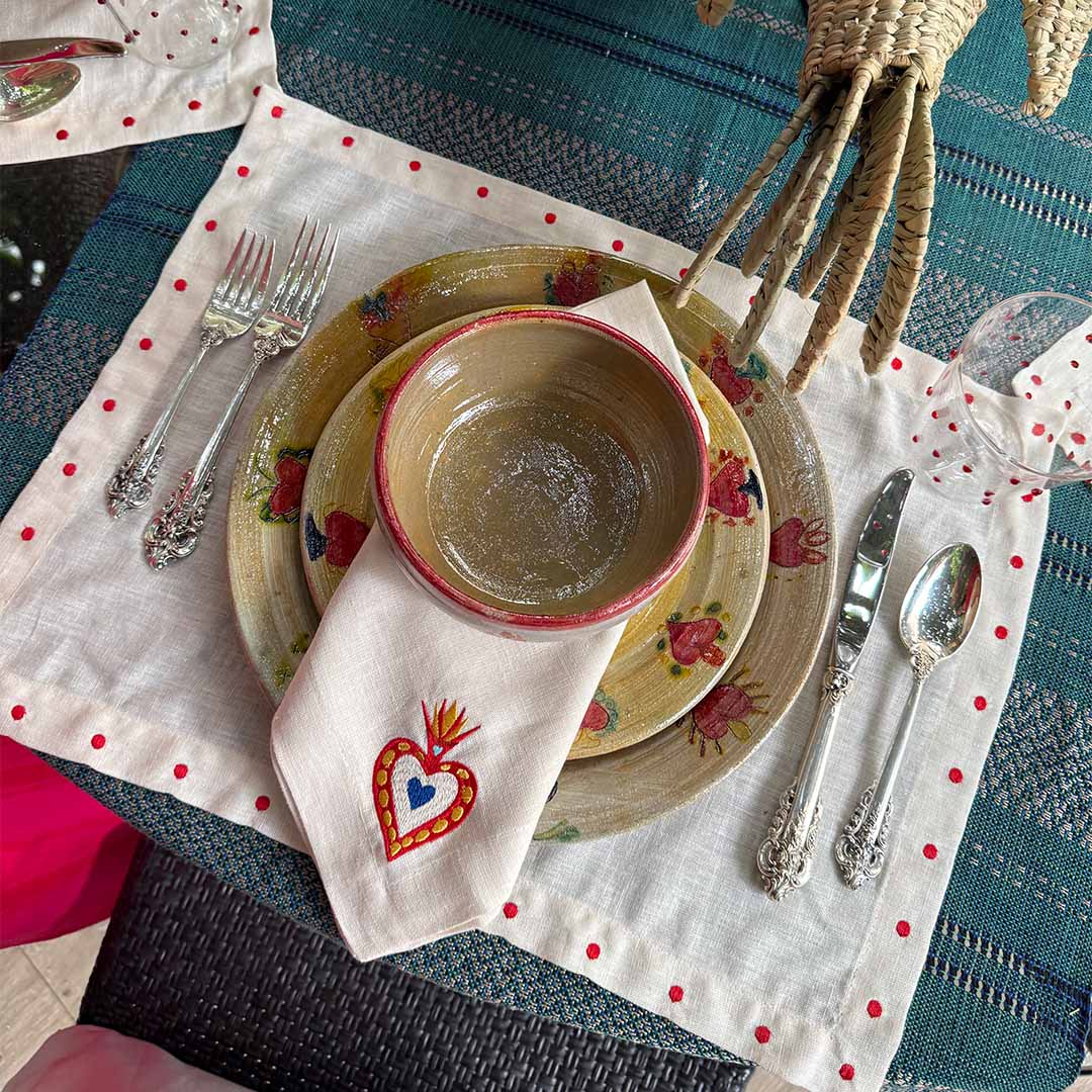 Llena tu mesa de tradición y belleza con los milagritos mexicanos. Servilletas de lino con corazones coloridos bordados que representan la fortuna, el amor y los buenos deseos.