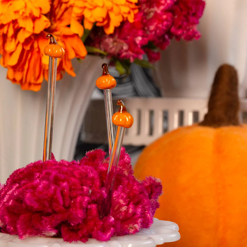 Calabazas coquetas, con vidrio super resistente y seguro para usar con bocadillos y/o finger food. Recibe a tus invitados de Thanksgiving, DÃa de Muertos, Halloween o reuniones de otoño con estos pinchos.