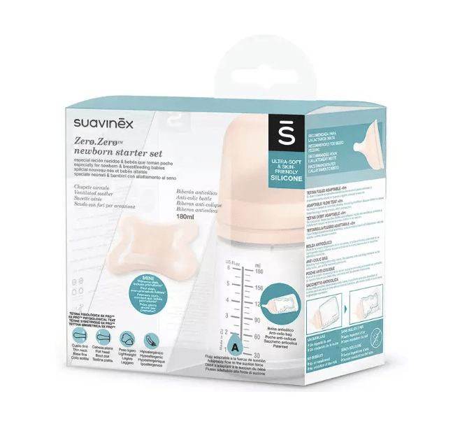 Set de Suavinex ideal para los recién nacidos ya que incluye un biberón Zero-Zero 180 ml con tetina de flujo adaptable + Chupete Zero-Zero Mini.