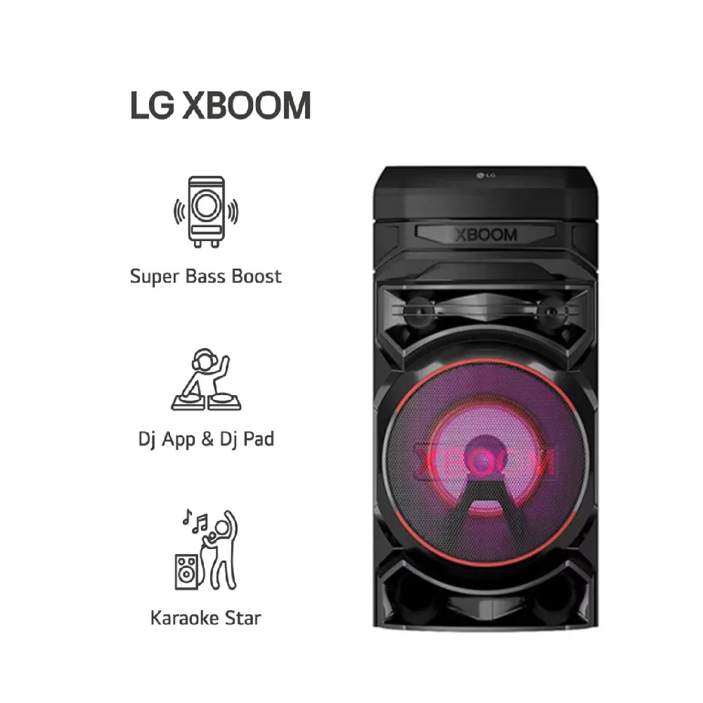 Potencia: 700 W (en algunas tiendas aparece como “700 Watts”) , Color: Negro , Dimensiones: 68.5 cm de alto × 33 cm de ancho × 34.4 cm de profundidad , Peso: ~ 13.8 kg , Funciones y conectividad, Bluetooth (Multi-Bluetooth) , 2 puertos USB , Entrada para micrófono (6.3 mm) , Entrada para guitarra (6.3 mm) , Karaoke Star, control de sonido vocal, efectos de eco y ajuste de tonalidad de voz (Key Changer) , Iluminación multicolor / luces LED que cambian con el ritmo de la música , App LG XBOOM y funciones DJ App / DJ Pad , Radio FM , Formatos de audio compatibles: MP3, WMA